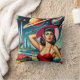 A confident, retro-style woman among the planets and rockets that surround the guests at the beach. The vivid colors, bold energy, and vintage theme pay tribute to the thrilling imagination of midcentury book covers and movie posters.