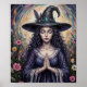 This whimsical poster features a serene witch in a jeweled black hat, hands pressed in prayer, flowing dark curls and lace gown framed by vivid wildflowers and swirling cosmic light. Finished in an oil acrylic brush painterly style.