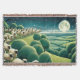 A flock of sheep roams across rolling hills under a starry night sky, with a bright full moon illuminating the landscape. The scene captures the tranquility of the countryside, with lush, green fields and neatly arranged trees.