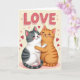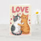 This card shows two chubby, stylized cats hugging in the center on a soft cream background. One cat is gray and white, and it wraps its arms around an orange tabby with lighter stripes. Both cats have closed, upturned eyes, wide happy smiles, tiny pink noses, and rosy blush on their cheeks, which makes the hug feel extra sweet ❤️. A light pink oval under them acts like a little base, and small hearts float around to add to the romantic feel 💌. At the top, the word “LOVE” appears in large pink letters with a dotted, textured look, making the message clear right away. The colors stay gentle overall, with creams, grays, oranges, and lots of pink and red tones that fit the Valentine’s Day theme 🍫.