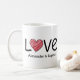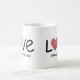 This modern minimalist coffee mug features a bold black "LOVE" typography design accented by a hand-drawn, vibrant red scribble heart. The front and back include customizable text templates, allowing you to easily add names, an anniversary date, or a heartfelt message. Designed for couples who love contemporary art, this chic mug makes a thoughtful gift for weddings, engagements, or Valentine's Day. The high-contrast black and red palette ensures the design stands out in any kitchen or office.