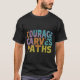 T-shirt-designen innehåller frasen "Courage Carves Väg" i fet stil med flera färgader. Det pulserande färg och det dynamiska teckensnittet skapar ett synligt slående och inspirerande påstående. Utformningen förmedlar ett budskap om uthållighet, beslutsamhet och mod att övervinna utmaningar och skapa nya möjligheter.
