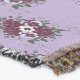 Le design présente une répétition harmonieuse de bouquets de violettes sur un fond lilas, magnifié par de délicates franges multicolores sur les bords qui soulignent son aspect artisanal.