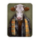 Den här utformningen har en porträtt av en ko i läder jacka och halsduk.