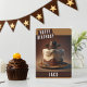 Ett födelsedagskort med en cowboymatad födelsedagskalas på framsidan med "Grattis på födelsedagen", fetstil med versaler. Anpassa fronten genom att lägga till ditt/dina namn. Insidan av kortet har plats för det skrivna eller handskrivna meddelandet.