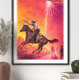 This striking sci-fi western illustration blends the rugged spirit of the Old West with mysterious extraterrestrial energy. The artwork depicts a fearless cowboy riding horseback across a desert landscape while a glowing UFO hovers above, sending a bolt of lightning-like energy toward the ground. The dramatic sky filled with warm reds and oranges adds an intense cinematic atmosphere to this surreal alien encounter scene.