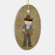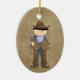 Cute lille cowboyen med mörk hår, klädd i blått med läderväst, kranar och stövlar. Han håller ett lariat-rep. På motsatt sida finns en Sheriffs Badge och en ställe för att du ska anpassa den med dina söners namn. Roligt julprydnad för din lilla cowpoke!