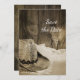 Meddela dina kommande informella men ändå stiliga bröllop med de charmiga Cowboy Hat and Barn Wood Country Western Wedding Save the Date-korten. Denna rustika och chic skräddarsydda ranch-tema vigsel "spara datum"-inbjudan har ett pittoreskt svartvitt sepiafärgat fotografi av en cowboyhatt, vit brudslöja och vintage spetskantad linnehandduk med jutesäck och väderbiten träbakgrund. Perfekt inspiration eller idé för en cowgirlbrud och cowboykonfirm som planerar en informell bondgårds- eller ladubröllopsfest.