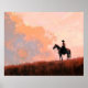 Målning av en cowboy sitta på en häst som tittar på molnformationer vid soluppgång eller solnedgång. Det dominerande färg i denna Westerna teckning är korall, med denim blå i molnen och mörkens rost i förgrunden.