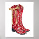 Den här bilden poster en vattenfärg porträtt i ett par röda cowgirl-botar som är dekorerade med ett guld-band.
