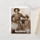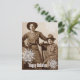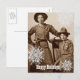Vintagefoto av två kvinnor från det gamla väst. En sitter och en står, De har båda kjolar med fransar och bär hattar. En har en pistol i ett hölster vid midjan. Tre vita snöflingor och en anpassningsbar julhälsning.