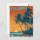 Detta nostalgiska vintage affisch fångar Cozumas tropiska skönhet vid solnedgången. Handflatan träd går försiktigt över en tyst strand, medan sol går in i horisonten och kastar varma orange- och rosor över himmel. Med struktur och en färg-palett med sol som fader, frammanar konstverket den bakåtsträvande charmen för ögetar i mitten av århundradet - perfekten för fläkt av vintage resor konst och Karibien rymmer.
