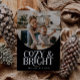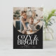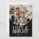 Elegant holiday card featuring a typography text that says "cozy & bright" below your arch shaped photo. Add a second photo on the back along with your message. Background is black.