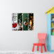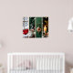 Four-panel cozy Christmas scenes art print. Features mitten, cocoa, cardinal ornament, and candle on a festive green and cream background.