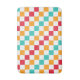 Alternating red, orange, teal, and white squares create a colorful, vibrant checkerboard pattern, conveying an energetic and playful tone.