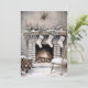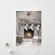 A festive stone fireplace trimmed with snowy evergreen boughs, glowing candles, and three hanging stockings sets a classic holiday scene. Firewood, snowfall, and a wooden chair complete the quiet, rustic charm. The back of the card includes the verse Wishing you peace, joy, and happiness this holiday season, with space to personalize your name or signature.