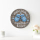 This image features a round wall clock with a cozy, rustic design resembling weathered wooden planks. The face is dominated by an endearing graphic of two blue mittens with white snowflake patterns and furry cuffs. The surrounding text reads, "Winter Wishes & Snowflake kisses," making it a charming and decorative timepiece perfect for adding a touch of warm, seasonal cheer to a home during the colder months.