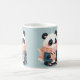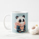 An utterly adorable illustration of a fluffy panda getting cozy for the winter. Dressed in a warm blue jacket and a stylish pink scarf, this sweet bear is holding a large mug of steaming hot chocolate topped with marshmallows. With gentle snowflakes falling in the background, this image is the epitome of winter comfort and cuteness.