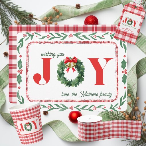 Celebrate the season with this charming gift tag. The word "JOY" takes center stage, capturing the heartfelt spirit of the holidays. With a bright red plaid trim, this card blends traditional elegance with rustic charm.