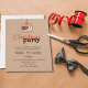 Julfestinbjudan, som gjorts i ett pappert hantverk, med bilder av svarta, röda, vita och guld blandade boll-prydnadsföremål, överst. Anpassa anpassningsbarna fält till kostym som din julfest behöver.