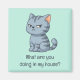 Cute cartoon illustration of a cranky grey tabby cat glaring at the viewer. Customizable text.