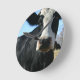Lustigt bild av en svart ko med galna öga med blå himmel-bakgrund. Gör en Underbar gåva!