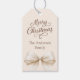 En kräm, mjuk beige bakgrund och båge, mocha, muterad brun text. God jul är skrivet med ett elegant handskript i stil. Anpassa och lägg till din familj namn. Tillbaka: utrymme för skriva för hand.