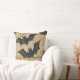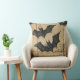 Benvit denim Halloween-lappverk dekorativ kudde med syrat fladdermus under flygning. Drömst, grymge-stil-struktur med fetstik stygn skapar en rustisk gotisk estetik. Perfekt för fladdermus älskare, gotisk décor eller unika Halloween-gåvor.