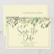 Modern Spara datum meddelande har vattenfärgsfärgerna eucalyptus löv gräns på gräddbakgrunden med textblock grönt anpassade i modernt typsnitt. Lägg till QR-kod för personligt bröllp webbplats på baksidan.