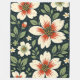 The design features a repeating floral pattern illustrated in a hand-drawn style. Large cream-colored flowers appear with wide rounded petals and bold starburst centers in warm red and orange tones. The flower centers are detailed with small circular shapes in golden yellow, giving a lively and textured look. Surrounding the flowers are flowing green leaves and thin stems in soft olive shades, adding balance and movement. Small simple blossoms and scattered dots in yellow, white, and light orange add decorative detail and rhythm to the composition. The background is a deep dark green, which enhances the contrast and makes the floral elements stand out clearly. The overall color palette feels warm, natural, and harmonious, with a vintage-inspired illustration feel.