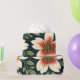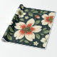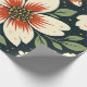 The design features a repeating floral pattern illustrated in a hand-drawn style. Large cream-colored flowers appear with wide rounded petals and bold starburst centers in warm red and orange tones. The flower centers are detailed with small circular shapes in golden yellow, giving a lively and textured look. Surrounding the flowers are flowing green leaves and thin stems in soft olive shades, adding balance and movement. Small simple blossoms and scattered dots in yellow, white, and light orange add decorative detail and rhythm to the composition. The background is a deep dark green, which enhances the contrast and makes the floral elements stand out clearly. The overall color palette feels warm, natural, and harmonious, with a vintage-inspired illustration feel.