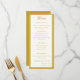 Design front features a pale-cream background to your customizable text. Heading is displayed in an elegant ochre font in top center. Following the traditional format for a wedding menu, all text is customizable and displayed in ochre. Entire design is framed by an ochre and pale-cream border.