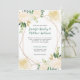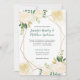 Bröllopappningar med kräm och vit ros, guld glitter och guld och grönt löv och andra grönska med guld geometrisk övertäckning. Bakgrunden är guld. Mallen är enkel att anpassa - ditt namn är ett handskrivet calligrafskript för elegant och brödtexten är ett modernt teckensnitt. Kortets baksida är en vattenfärg som tvättar i guld.