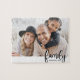 The design places the word “family” in elegant black script at the bottom right corner, slightly overlapping the edge of the photo for a modern, layered look. Directly underneath “family,” there is space to add the family name and date established for a personalized finishing detail.