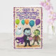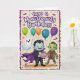 Adorable spooky birthday greeting featuring friendly vampire, zombie, and ghost monsters with colorful balloons and playful "Have a Monstrously Fun Birthday" message. Perfect for kids who love cute creepy creatures and Halloween vibes year-round. Vibrant purple, green, and orange colors with confetti and bats make this the ideal birthday wish for your little monster! generativecontent.