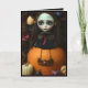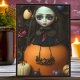 Skicka ett läskigt Halloween-hälsning med det här gotiska dockkortet i ett härligt, surrealistiskt och vackert stil. Traditionell orange och svart med blodrött rosett band, gylda pumpor och antika smycken gör den här kräpsöta flickan till en unik besökare för spookysäsongen.