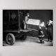 Gamla 1920-talets foto av en läskig liten kille och Jultomten laddade ur en låda från en amerikansk Railway Express lastbil vid jul.