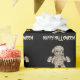 Desteis ursprungliga tecknad illustration av en läskig mummy-figur som är gjord i mönster. Under bilden finns det ett anpassningsbara textområde som nu lyder "Happy halloween!". Bakgrunden färg är svart.
