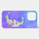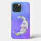 Iphone case har ett vitt halvmånsfärande måne med färgade geometriska former i blått, gult och lila med ansikte i lila och blå stjärtprickad himlar.