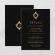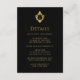 Detta eleganta svarta och guldfärgade bröllopsfodral med vintagekaraktär har ovanför texten en förgylld vintageinspirerad vapensköld med ett monogram, bestående av brudens och brudgummens initialer åtskiljda av en linje. Bakgrunden är svart. All text har en guldfärg liknande vapenskölden. Du kan inkludera detaljer om mottagningen, boende, vägbeskrivning, bröllopspresenter, bröllopswebbplats med mera.