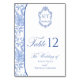 Delft blue floral table number card, designed in a refined blend of chinoiserie and French toile de Jouy style. The soft botanical illustrations frame an arched layout featuring an elegant wedding crest monogram, perfect for couples who love vintage, historic, and European-inspired aesthetics. Classic script typography pairs beautifully with the ceramic-blue palette, making this design an effortless nod to the tradition of “something blue.” Fully customizable with your names, wedding crest and table number, it’s an exquisite choice for any romantic or sophisticated wedding theme.