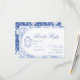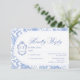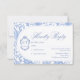 Delft blue floral RSVP response card, designed in a refined blend of chinoiserie and French toile de Jouy style. The soft botanical illustrations frame an arched layout featuring an elegant wedding crest monogram, perfect for couples who love vintage, historic, and European-inspired aesthetics. Classic script typography pairs beautifully with the ceramic-blue palette, making this design an effortless nod to the tradition of “something blue.” Fully customizable with your RSVP date, guest name and menu choice, it’s an exquisite choice for any romantic or sophisticated wedding theme.