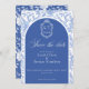 Delft blue floral save the date card, designed in a refined blend of chinoiserie and French toile de Jouy style. The soft botanical illustrations frame an arched layout featuring an elegant wedding crest monogram, perfect for couples who love vintage, historic, and European-inspired aesthetics. Classic script typography pairs beautifully with the ceramic-blue palette, making this design an effortless nod to the tradition of “something blue.” Fully customizable with your names, date, and location, it’s an exquisite choice for any romantic or sophisticated wedding theme.