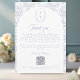 Dusty Blue Monogram Crest Wedding Thank you card: Vintage-inspired line art monogram crest with elegant dusty pale blue typography. Features a chinoiserie floral pattern in the shape of an arch and on the reverse for timeless sophistication. Elegant script font for a formal and classic style. Let your guest get access to your wedding online photo album or photo website.