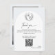A Simple Elegant Monogram Crest Wedding Thank You Card: Vintage-inspired line art monogram crest with elegant black on white classic typography. Features a shape of an arch and on the reverse for timeless sophistication. Elegant script font for a formal and classic style. Add your own webside for wedding photo album with a custom QR code or simply delete it for a more traditional card.