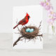 This card shows a red-crested bird with a dark mask around its face, perched close to a small nest as if keeping a gentle watch over what it loves ❤️. The feathers shift from deep red on the head and body to warmer brown tones on the wings and tail, adding a soft, romantic warmth to the scene. The bird’s sideways glance feels like a tender check-in, like a quiet friend staying near when it matters most. In the nest sit two smooth, pale blue eggs that stand out calmly against the warmer reds and browns, like tiny promises guarded with care 🌼. The nest is built from thin, tangled twigs and branches, wrapped tightly together and anchored to a slender bare limb. A wide white background surrounds everything, leaving lots of open space so the eye lingers on the closeness between bird, nest, and eggs. There is no visible wording on the front, keeping the layout simple with the image centered as the main focus. Soft, even light brings out the fine feather textures, the rough twig weave, and the clean oval shapes of the two blue eggs.