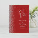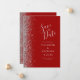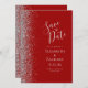 Det moderna bröllop spara datum-kortet från elegantens lämnat kant har ett silver faux glitter gräns. Anpassadet kombinerar handskrift, tryckplåt och kursivt typsnitt med handskrift av silver grått på en röd bakgrund. Den omvända sidan har en matchande röd och silver-design.