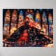 En fängslande flicka i en svart och krimsonröd klänning står graciöst i en katedral med levande glasmålningar. Den gotiska elegansen i hennes klänning, prydd med blommande rosor, kontrasterar vackert med hennes eldröda flödande hår.