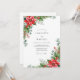 This design showcases a vibrant seasonal arrangement of red poinsettias and green holly leaves. Lush eucalyptus sprigs and pine needles provide a soft, textural contrast against the white background. Delicate red berries are scattered throughout the botanical motifs, evoking a classic holiday atmosphere. The palette of crimson and emerald creates a sophisticated mood.