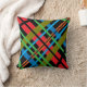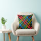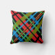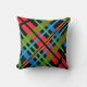 Detta glupska dekorativ kudde-visning en färglös abstrakt mönster av korsande linjer i rött, orange, grönt, gult, blått och svart mot svart bakgrund. Bilden upprepas på baksidan.